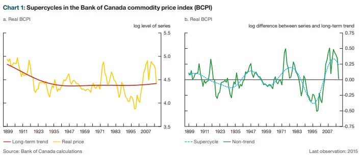 A global commodities supercycle is defined as sustained increase in the price of commodities worldwide that lasts for more than five-years. We’ve been through a couple of them in the last few decades, including the one beginning in 2001 after China’s admittance to the WTO and the one immediatley following the 2008 financial crisis. In these years commodity prices stayed significantly above their long-term trends. The Bank of Canada in a recent paper defines these supercycles as the Commodity Price Index deviating from its long-term trend by more than 10%. It identified four bull-cycles between between 1990 and 2015, using this methodology.